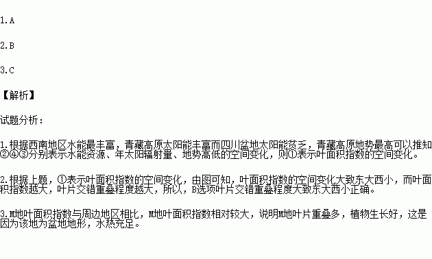 Ò¶Ãæ»ýÖ¸ÊýÖ¸Ö²ÎïҶƬ×ÜÃæ»ýÓëµØ±íÃæ»ýÖ®±È¡£Ö¸ÊýÔ½´ó£¬Ò¶Æ¬½»´íÖØµþ³Ì¶ÈÔ½´ó¡£ÏÂͼÖÐËÄÌõÇúÏß´ú±íµÄÊÇË®ÄÜ×ÊÔ´¡¢ÄêÌ«Ñô·øÉäÁ¿¡¢µØÊƸߵÍÒÔ¼°Ò¶Ãæ»ýÖ¸ÊýµÄ¿Õ¼ä±ä»¯Ç÷ÊÆ¡£¾Ý´ËÍê³ÉÏÂÁÐÎÊÌâ¡£