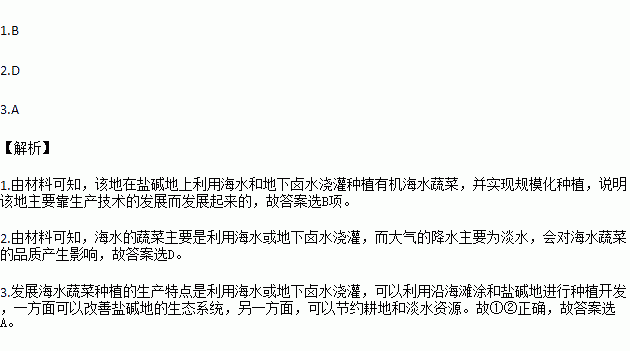 目前,山东寿光在盐碱滩涂上,利用海水或地下卤水浇灌种植有机海水蔬菜,并实现了规模化种植。据此完成下列各题。