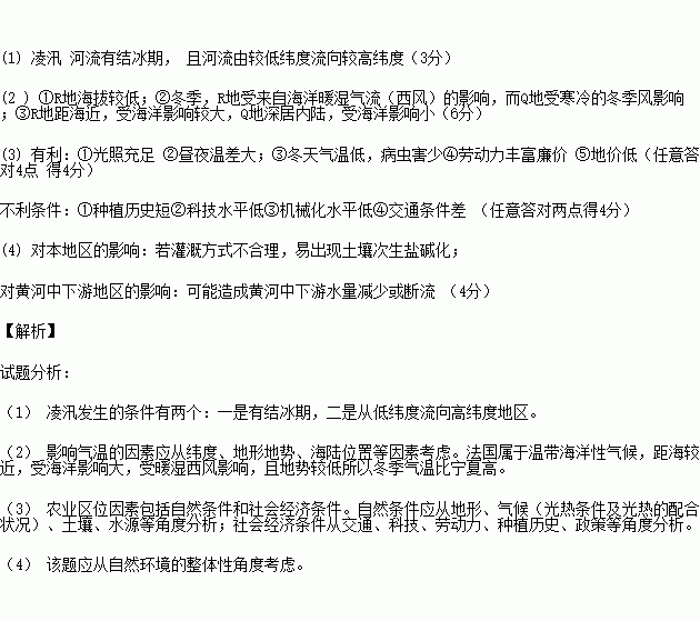 (2)简述法国R地一月份均温比宁夏Q地高的主要原因。(6分)