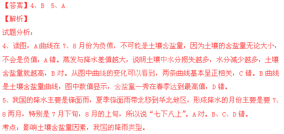 ¶Á»ª±±Æ½ÔijµØÕô·¢Ó뽵ˮ²îÖµ£¨¼´¶àÄêÆ½¾ùÕô·¢Á¿¡ª¶àÄêÆ½¾ù½µË®Á¿£©ÇúÏߺͱí²ãÍÁÈÀº¬ÑÎÁ¿¼¾½Ú±ä»¯ÇúÏßͼ£¬»Ø´ð4¡«5Ìâ¡£