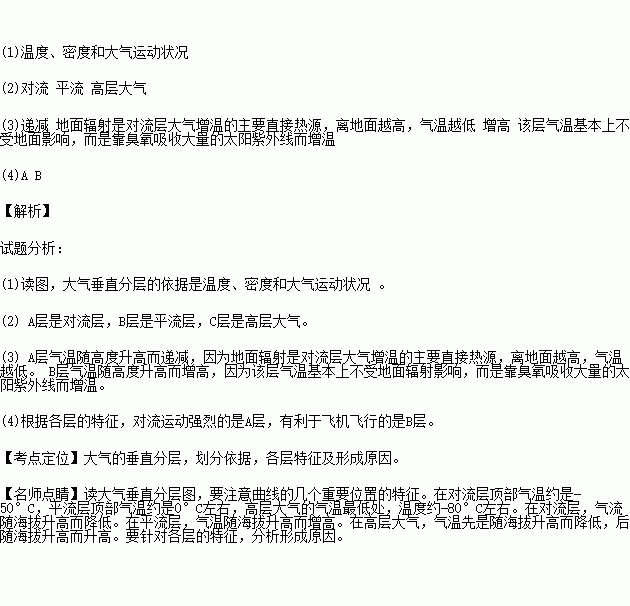 (4)对流运动强烈的是________层,有利于飞机飞行的是________层。(填字母)