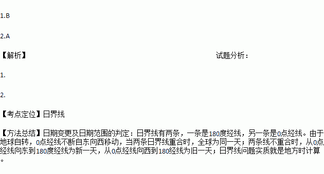 为避免日期混乱,国际上划定了日期变更线。下图是小明同学设计的日期钟,其短指针固定指向180°经线,长指针随时刻同步转动。据此完成下列小题。