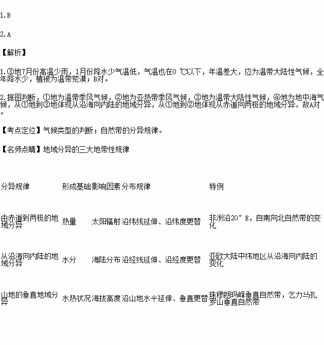2.若四地均位于亚欧大陆,则以下能体现自然带从赤道到两极地域分异规律的是