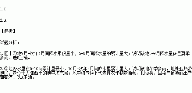 读北半球亚热带同纬度大陆东、西两岸沿海两地年降水量逐月累计曲线图,完成下列问题。