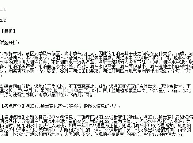 1.下列对该湖泊TSS 通量变化产生的影响的叙述,正确的一组是