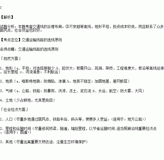 若在图中甲、乙两县城之间修一条公路,从经济、社会效益综合考虑,四个方案中最合理的是( )
