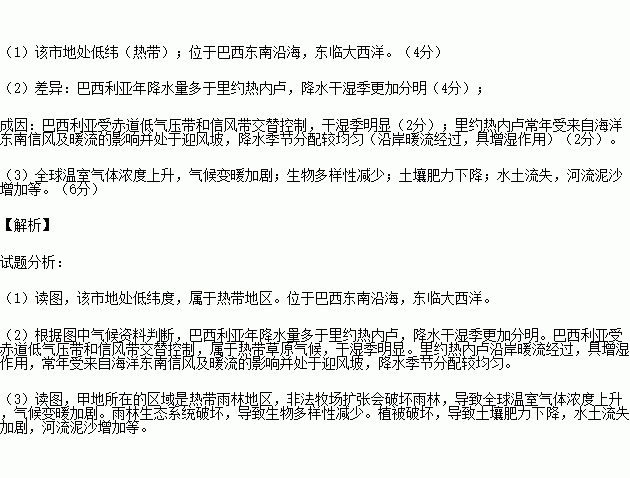 (2)依据上图,比较巴西利亚和里约热内卢降水特征的差异,并分析成因。