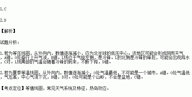 下面为北半球某区域等值线图,从外向内,数值逐渐减小,读图回答下列各题