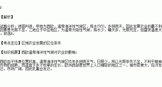 读世界两个区域示意图,图中甲、乙两地发展种植业生产最不利的自然条件分别是( )
