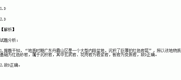 地质时期广东丹霞山区是一个大型内陆盆地,沉积了巨厚的红色岩层。后来由于地壳运动和外力作用形成了一片红色山群(丹霞地貌)。读图回答各题。