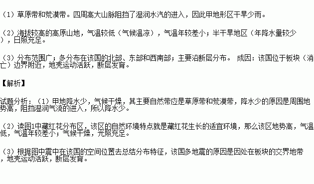 图1示意某国地形,图中甲区域为1000米等高线环绕地区;该国生产的藏红花约占世界总产量的四分之三。图2为该国7级及以上地震震中分布示意图。读图回答问题。