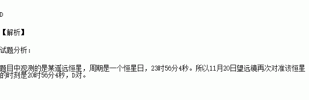 南京紫金山天文台于2009年11月19日21时,将一台天文望远镜对准某恒星,并保持望远镜位置和一切状况不变,到2009年11月20日望远镜再次对准该恒星的时刻是( )
