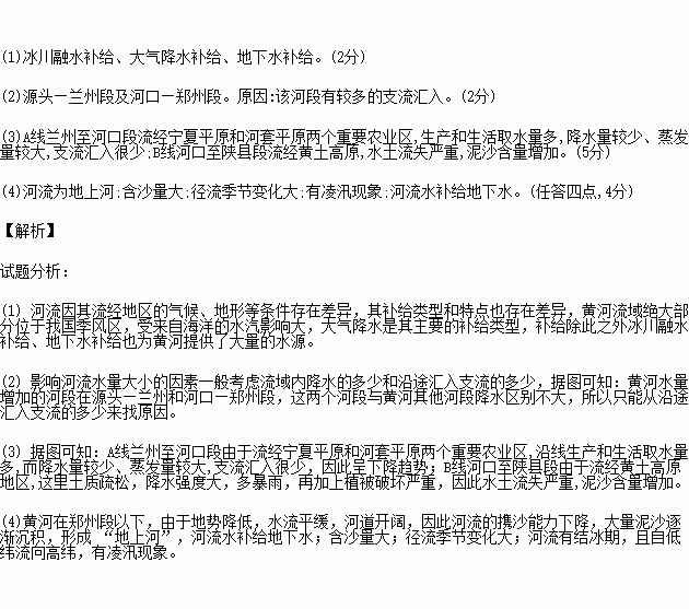 (1)写出黄河水的主要补给类型。(2分)