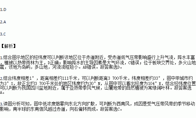 下图示意世界某岛屿,岛上多火山,大部分地区覆盖着森林,“烧芭”属于该国传统农耕方式,每年6~8月放一把火将森林烧成“空地”,并利用燃烧的灰烬作为“天然”肥料。下图为2016年6月10日该区域燃烧产生的烟雾扩散示意图。读图,完成下列各题。