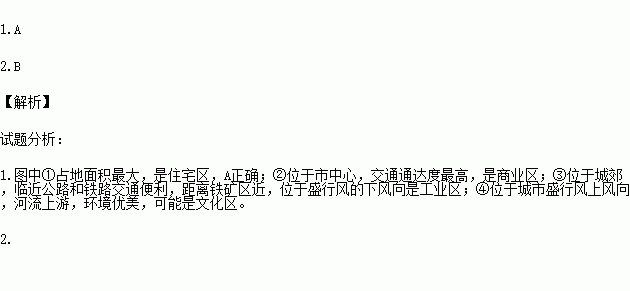 A.①-住宅区 B.②-工业区 C.③-文化区 D.④-商业区