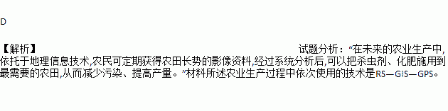 在未来的农业生产中,依托于地理信息技术,农民首先可定期获得农田长势的影像资料,再经过系统分析,最后把杀虫剂、化肥施用到最需要的农田,从而减少污染、提高产量。依次使用的技术是