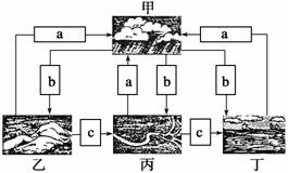 (1)图中丁→甲→丙→丁过程属于________循环。水循环的主要地理意义是________________________,__________________________________________。