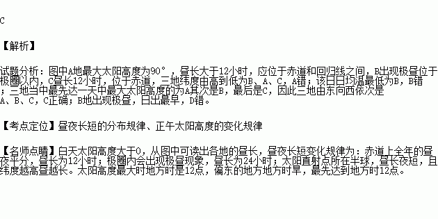 下图为A、B、C三地某日太阳高度日变化示意图,下列A、B、C依序排列正确的是: