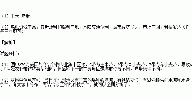 (1)图中C农业带的主要农作物是 ,A、B两处农业带作物类型相同,但品种不一,导致这种差异的主要因素是 (光照、热量、水分、土壤)。(4分)