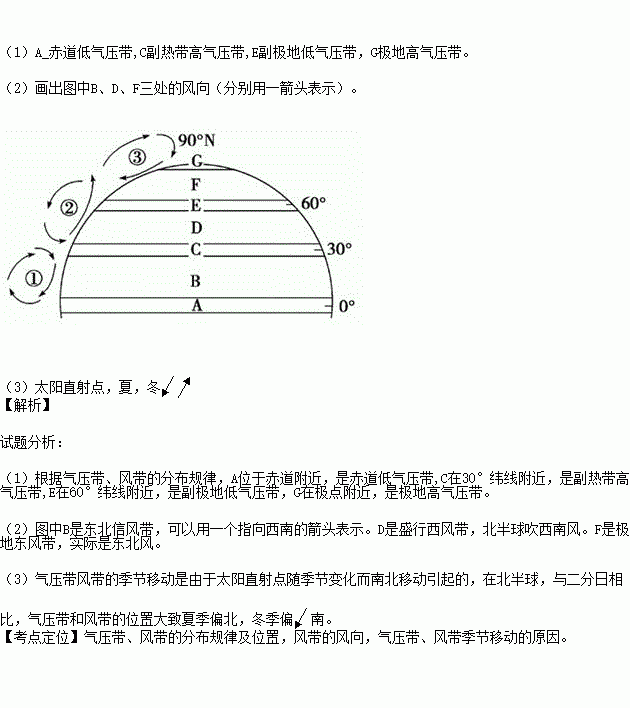 (1)填出图中气压带名称,A______________________,C_____________________,E_____________________,G______________________。