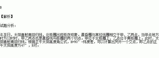 冬至日,晨昏圈与某经线圈相交于甲、乙两点,当甲点地方时为12时时,则另外一个交点乙点的正午太阳高度为