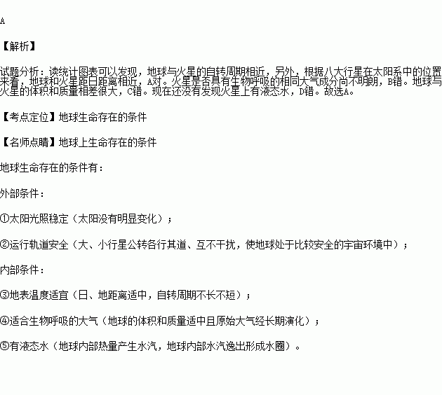 科学家认为火星是除地球以外最有可能存在生命的天体之一,火星与地球相比( )
