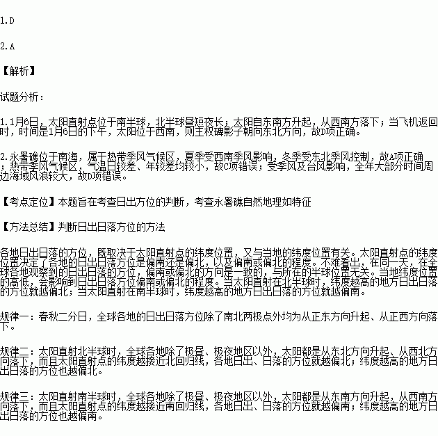 1.当飞机返回时,永暑礁上主权碑影子朝向为( )