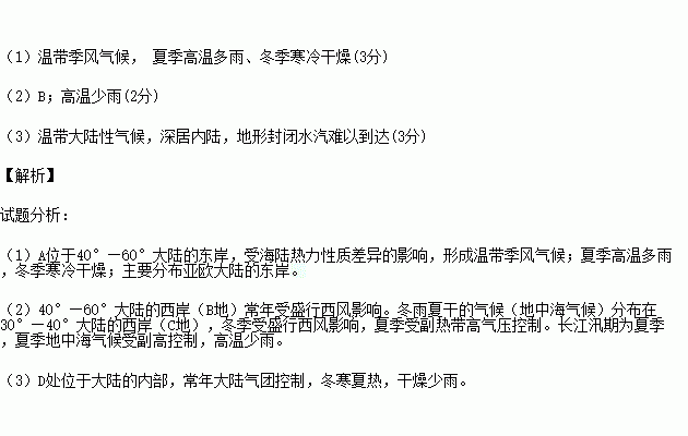 (2)B、C两地中,常年受西风带控制的地区是 地;长江进入汛期时,C地的气候特征是 。