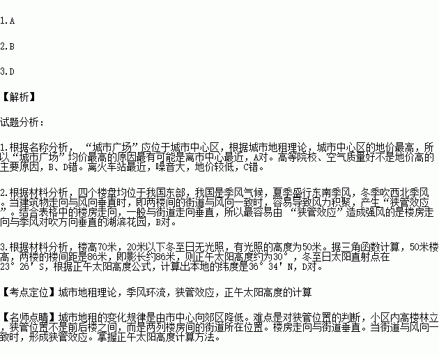 2.城市中高楼林立,如果布局不当,容易导致“狭管效应”,特别是两楼间的狭窄通道, 大风在“狭管效应”下可形成威力巨大的瞬时强风。材料中的四个楼盘,最容易由 “狭管效应”造成强风的是