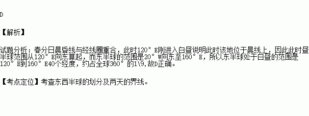 北半球春分日,当某地(30°N,120°E)刚进入白昼这一时刻,东半球(20°W向东至160°E)处于白昼的范围约占全球面积的