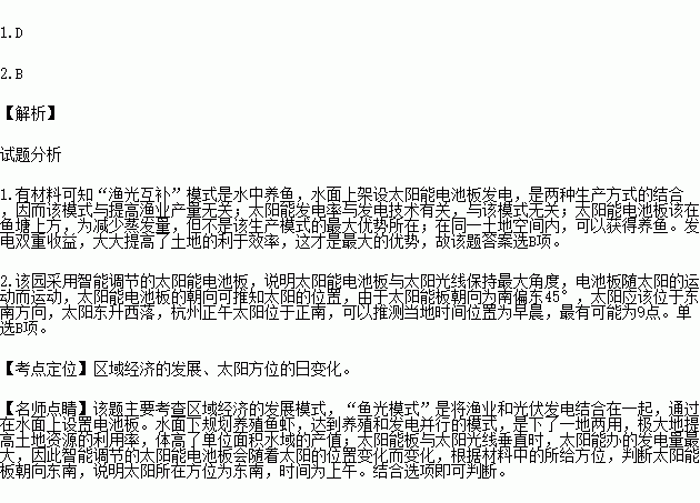 ¡°Óæ¹â»¥²¹¡±ÊÇÔÚË®ÃæÉϼÙÉèÌ«ÑôÄÜµç³Ø°å·¢µç£¬Ë®ÓòÓÃÓÚË®²úÑøÖ³µÄ·¢Õ¹Ä£Ê½£¬ÔÚÎÒ¹úÖж«²¿µØÇøµÃµ½ÍƹãÇÒÒÔСÐÍ·ÖɢʽΪÖ÷£¬ÏÂͼΪº¼ÖÝÊн¼ÇøÄ³¡°Óæ¹â»¥²¹¡±²úÒµÔ°¾°¹Ûͼ£¬¸ÃÔ°²ÉÓÃÖÇÄܵ÷½ÚµÄÌ«ÑôÄÜµç³Ø°å£¬ÒÔ×î´óÏ޶ȽÓÊÕÌ«ÑôÄÜ¡£¶ÁͼÍê³ÉÏÂÁи÷Ìâ¡£
