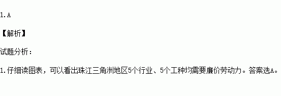 截至2月26日,2014年春节后珠江三角洲地区5个行业、5个工种用工缺口较大,读下表可知,珠江三角洲地区用工缺口较大的5个行业以