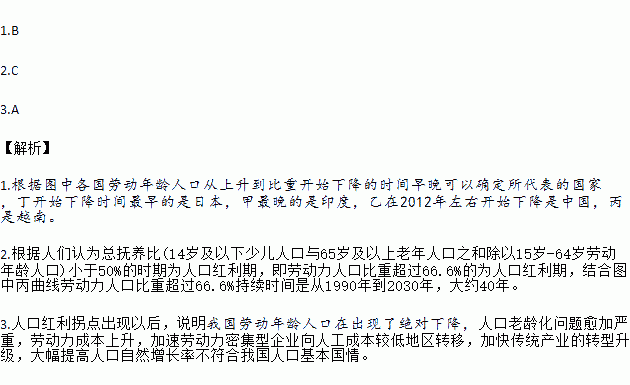 人口红利是指一个国家的劳动年龄人口占总人口比重较大,抚养率比较低,为经济发展创造了有利的人口条件,人口红利拐点显现往往是人口红利消失的前兆,2012年我国劳动年龄人口在相当长时期里第一次出现了绝对下降。下图为亚洲四个国家不同时期劳动年龄人口占总人口比重示意图.结合材料完成下列各题。