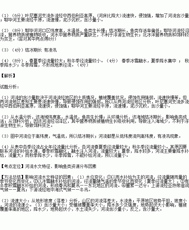 (1)分析叶尼塞河泥沙含量较多,而鄂毕河泥沙含量较少的原因。(6分)