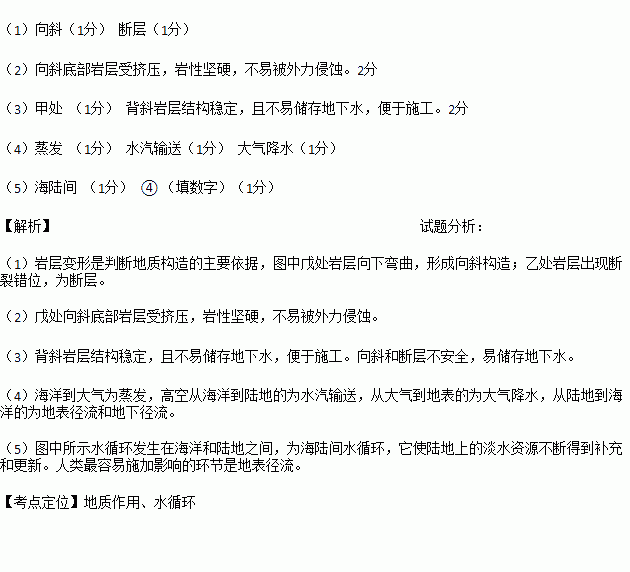 下图为“某地区的地质剖面图和水循环示意图”,读图回答下列问题。