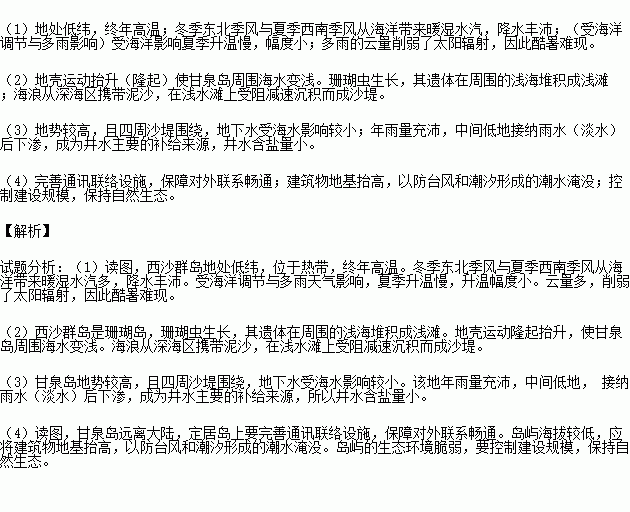 ¡¾²ÄÁ϶þ¡¿¸ÊȪµºÎ»ÓÚÖйúÎ÷ɳȺµºÓÀÀÖ»·½¸ÉÏ£¬ÊÇÎ÷ɳȺµºÖгö¶×îÍíµÄµº£¬µØÊƽϸߣ¬×î¸ß´¦8£®3Ã×£¬ÖÐÐÄµÍÆ½£¬ËÄÖÜΪɳÌáΧÉÕ£¬ÔÙÍùÍâΧÊÇɺº÷½¸»·ÈƵÄdz̲;¶«ÄϲàÓÐdzˮÂëÍ·£¬µºÉÏÓÐÒ»¿ÚÇåÄ©¹Å¾®£¬¾®Ë®Ç峺¸ÊÌðÊÊÒËʹÓã¬Ò²ÊÇÎ÷ɳΪÊý²»¶à¾ßÓеˮµÄµºÓì¡£
