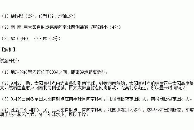 (1)图甲与图乙中的①②③④四点在地球公转轨道上的位置一致。请在图乙中画出9月29日地球在公转轨道上位置示意图(绘出地球和地轴)。 ______