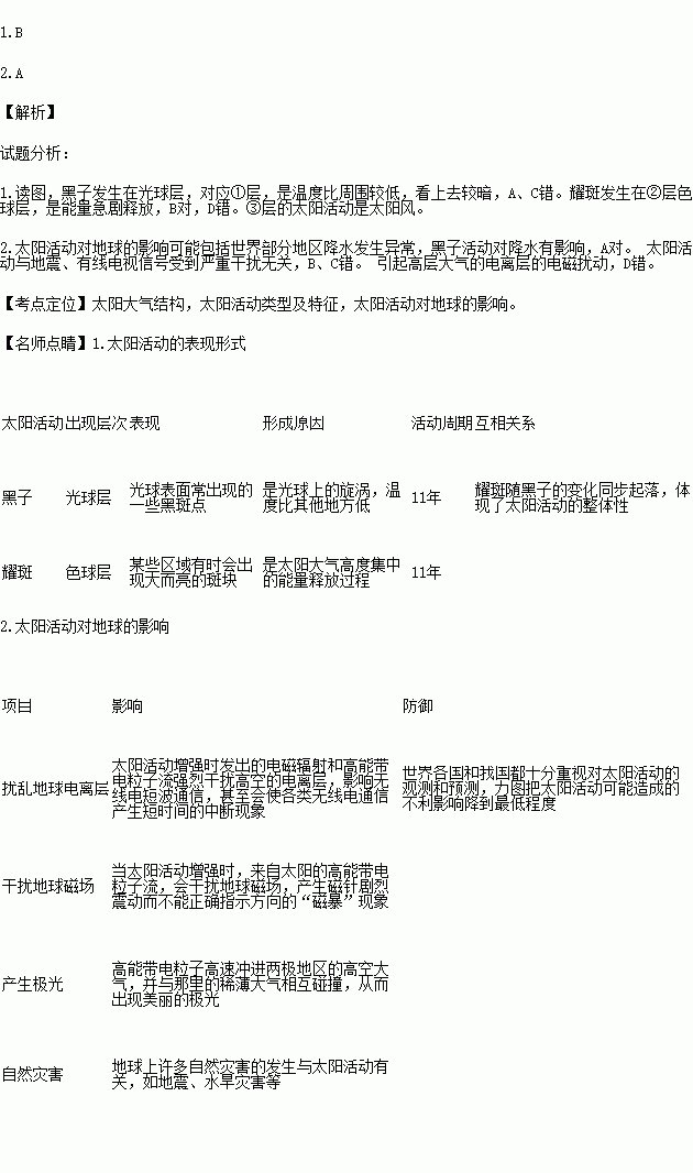 1.关于黑子或耀斑发生圈层及其成因对应正确的是