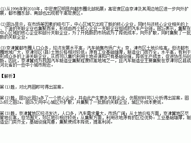(2)图2显示汽车制造业空间演变的一般过程,如图2a所示,在市场等因素的驱动下,在中心区形成汽车核心企业,上、下游的关联企业都集聚而来,形成由核心企业—关联企业组成的汽车产业链。如图2的b、c图,进一步阐述汽车制造业空间演变的过程和原因。
