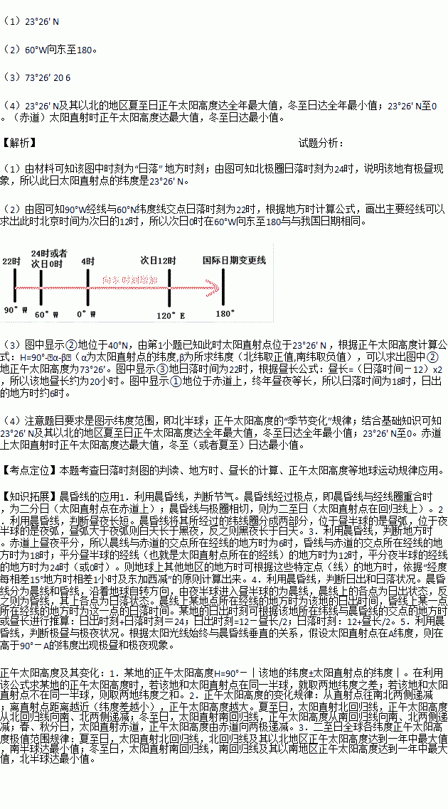 (2)该经线与60°N纬度线交点日落时,与我国日期相同的经度范围是 。