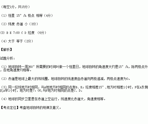 (1)地球自转一周360°所需要的时间叫做一个____日,地球自转的角速度大约是 ,除 外 ,各地角速度均为 。