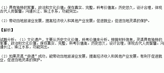 (1)说明灵渠能够申报历史文化遗产的原因。