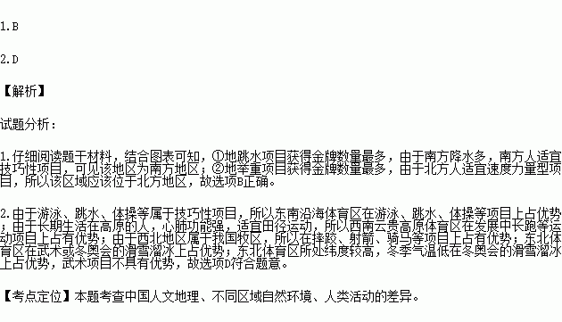 受地理环境的影响不同区域有不同的体育文化,在体育运动项目、体育运动普及率及体育竞技水平上表现出很大的差异,如南方人适宜技巧性项目,北方人适宜速度力量型项目,长期生活在高原的人,心肺功能强,适宜田径运动。读图表,完成下列问题。