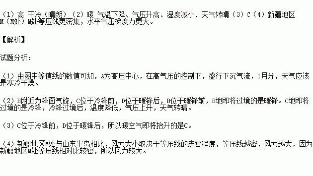 (4)此时,新疆地区M处与山东半岛相比,风力较大的是_____,理由是 。