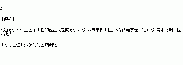 我国建设的四大工程,在促进西部大开发、资源大调度等方面具有重要意义。读四大工程线路示意图,四大工程中分别属于水资源跨区域调配、天然气跨区域调配、电能跨区域调配的是 ( )