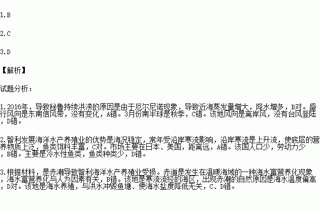 2016年3月初,秘鲁部分地区持续洪涝 。智利北部海洋水产养殖业因赤潮受损,其水产品主要销往日本和美国。读下图,完成下列各题