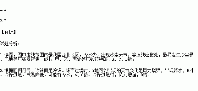 1.图中虚线范围内出现沙尘天气,其中最易发生沙尘暴的地点是( )