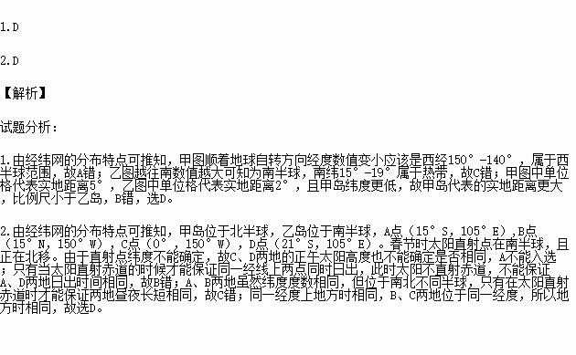 A.甲岛位于东半球 B.乙岛面积比甲岛大