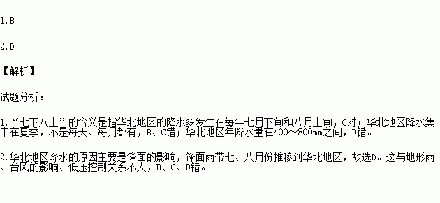 中央电视台“天气预报”栏目说,华北地区的降水有“七下八上”的说法,据此判断下列各题。