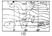 (1)在图中分别标出c地1月和7月的盛行风向。(3分)